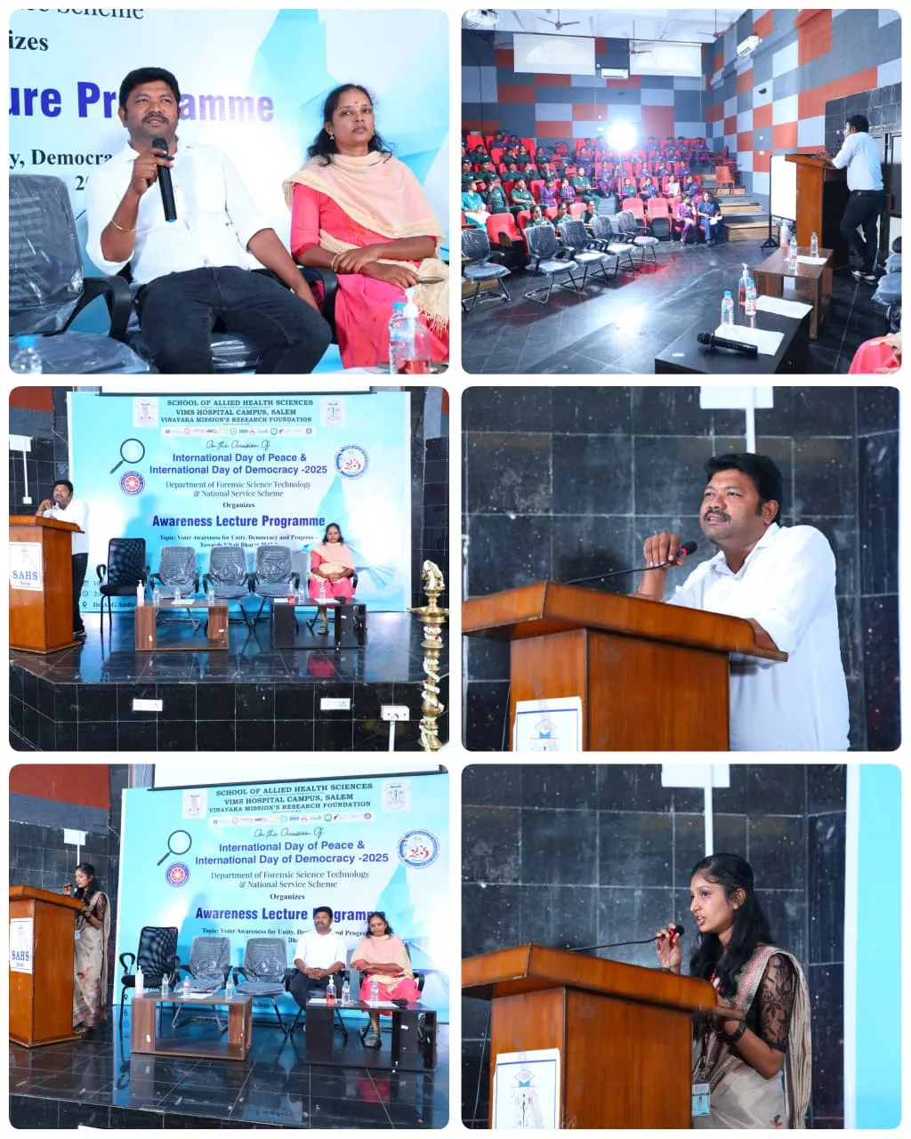 School of Allied Health Sciences, Vinayaka Mission’s Research Foundation (Deemed to be University), Salem. On the occasion of the International Day of Peace and the International Day of Democracy, the Department of Forensic Science Technology, in collaboration with the National Service Scheme (NSS), successfully organized an Awareness Lecture Programme and Prize Distribution Ceremony. Our respected Convenor,Prof. Dr. B. Sendilkumar, Dean, School of allied health sciences, delivered an inspiring and thought provoking speech highlighting the true value of democracy and the significance of peace day. The chief guest of the day Mr. Harinath, Deputy Tahsildar (South Salem) and Ms. Sangeetha VAO, Salem delivered an insight full lecture about voter awareness for unity, democracy and progress towards Viksit bharat 2047. Around 170 students are actively participated. The programme also included a prize distribution segment recognizing outstanding contributions and performances. We extend our heartfelt gratitude to all participants, faculty members, and volunteers for their enthusiastic participation and support in making this event a resounding success.