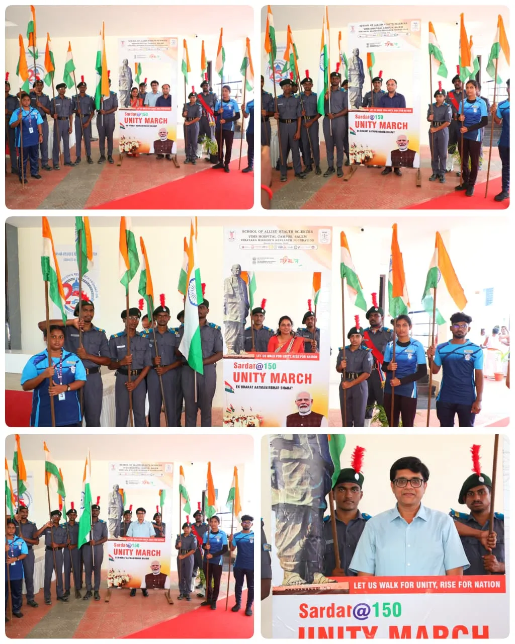 School of Allied Health Sciences, VIMS Hospital Campus, Vinayaka Mission’s Research Foundation (Deemed to be University), Salem. On the occasion of the 150th Birth Anniversary of Sardar Vallabhbhai Patel, the District Level Unity March (Padyatra) – Sardar@150, Ek Bharat Aatmanirbhar Bharat was successfully organized by the School of Allied Health Sciences in association with SAHS Youth Club & Mera Yuva Bharat (MY Kendra), My Bharat Kendra, Salem District. The Unity March was inaugurated by Mr. Vivek Yadav, I.A.S., District Assistant Collector (Training), Salem, along with Mrs. S. Keerthana, District Youth Officer & Mr. B. Valluvan, Accounts & Programme Assistant, MY Bharat Kendra, Salem. Prof. Dr. B. Sendilkumar, Dean & Director, School of Allied Health Sciences, delivered the welcome address and highlighted the life and legacy of Sardar Vallabhbhai Patel, emphasizing his pivotal role in uniting the nation. The Chief Guest, Mr. Vivek Yadav, I.A.S., in his inspiring address, spoke about the visionary leadership of Sardar Vallabhbhai Patel, his relentless efforts in integrating princely states & how his ideals continue to inspire the youth to work towards a united and self-reliant India. Mrs. S. Keerthana, District Youth Officer, spoke about the importance of National Unity Day & motivated the students to uphold the values of integrity, unity and nation-building in their daily lives. The celebration featured a prayer song, lamp lighting, keynote address, felicitation, Unity Day Pledge & Aatmanirbhar Bharat Pledge, followed by the distribution of 600 certificates to participants. A special highlight of the event was the “Sardar@150 Selfie Stand”, where participants joyfully captured memorable moments, showing their pride and unity in honour of the Iron Man of India. Heartfelt thanks to all dignitaries, faculty members, students and volunteers for their active participation and contribution in making this patriotic celebration a grand success.